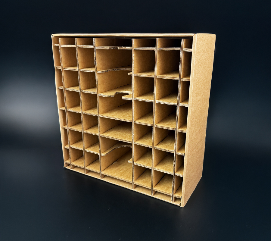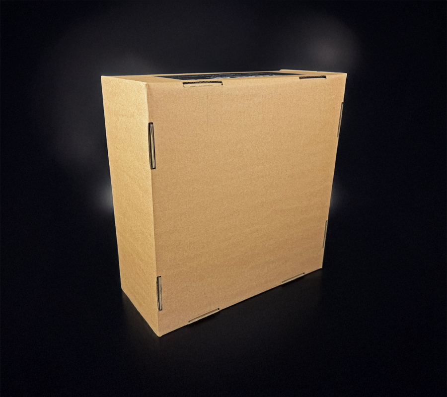 Measuring 43cm by 20cm by 45cm, the structure demonstrates how E-fluted board construction can deliver strength without unnecessary weight. The geometric artwork and vibrant colour show how contemporary design can transform functional packaging into a bold brand statement. A clear visual space within the design highlights where a logo or campaign messaging could be applied in a bespoke version, demonstrating how easily the format can be adapted for individual clients.
